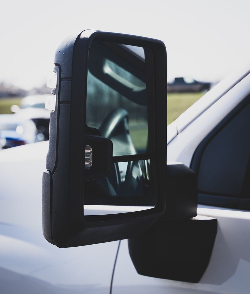 - Mirrors, outside high-visibility vertical trailering lower convex mirrors, manual-folding/extending (extends 3.31" [84.25mm]), molded in Black